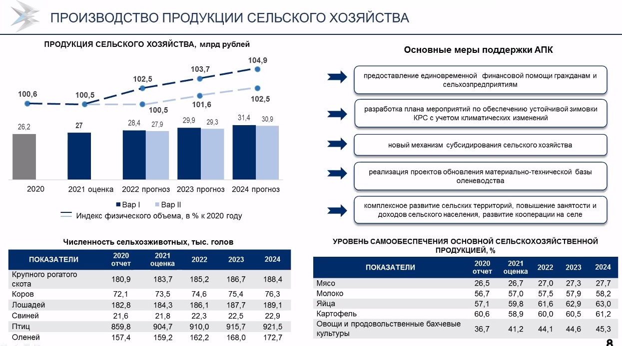 Говоря о негативных последствиях лесных пожаров и засушливого лета 2021 года, министр экономики подчеркнула, что правительством республики организована работа по предоставлению за счет резервного фонда Правительства РФ и республики единовременной финансовой помощи гражданам и сельхозпредприятиям. К 2024 году прогнозируется достичь до 31,4 млрд рублей валовой продукции сельского хозяйства со среднегодовым ростом в сопоставимых ценах на 1-2%.